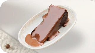 Yumuşak kakaolu kek üzerinde nuga ve el yapımı karamel; taze kavrulmuş yer fıstığı ve sütlü çikolata ile servis edilir